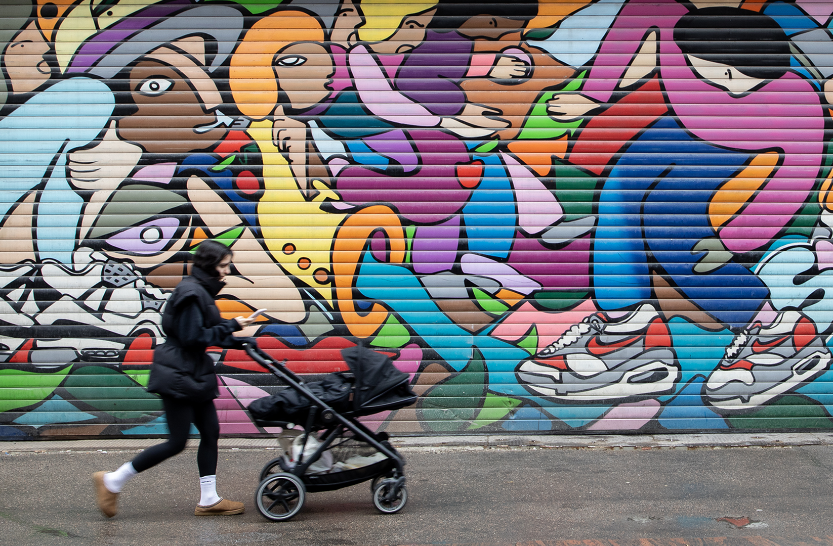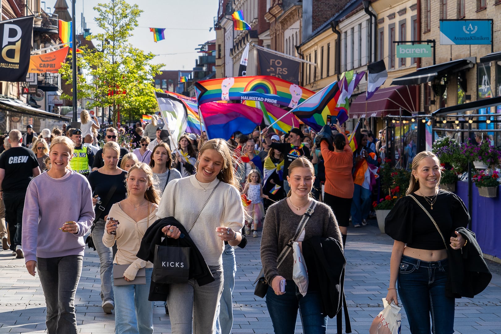 En bild med färg och folk i rörelse, det livar upp i Halmstad centrum.