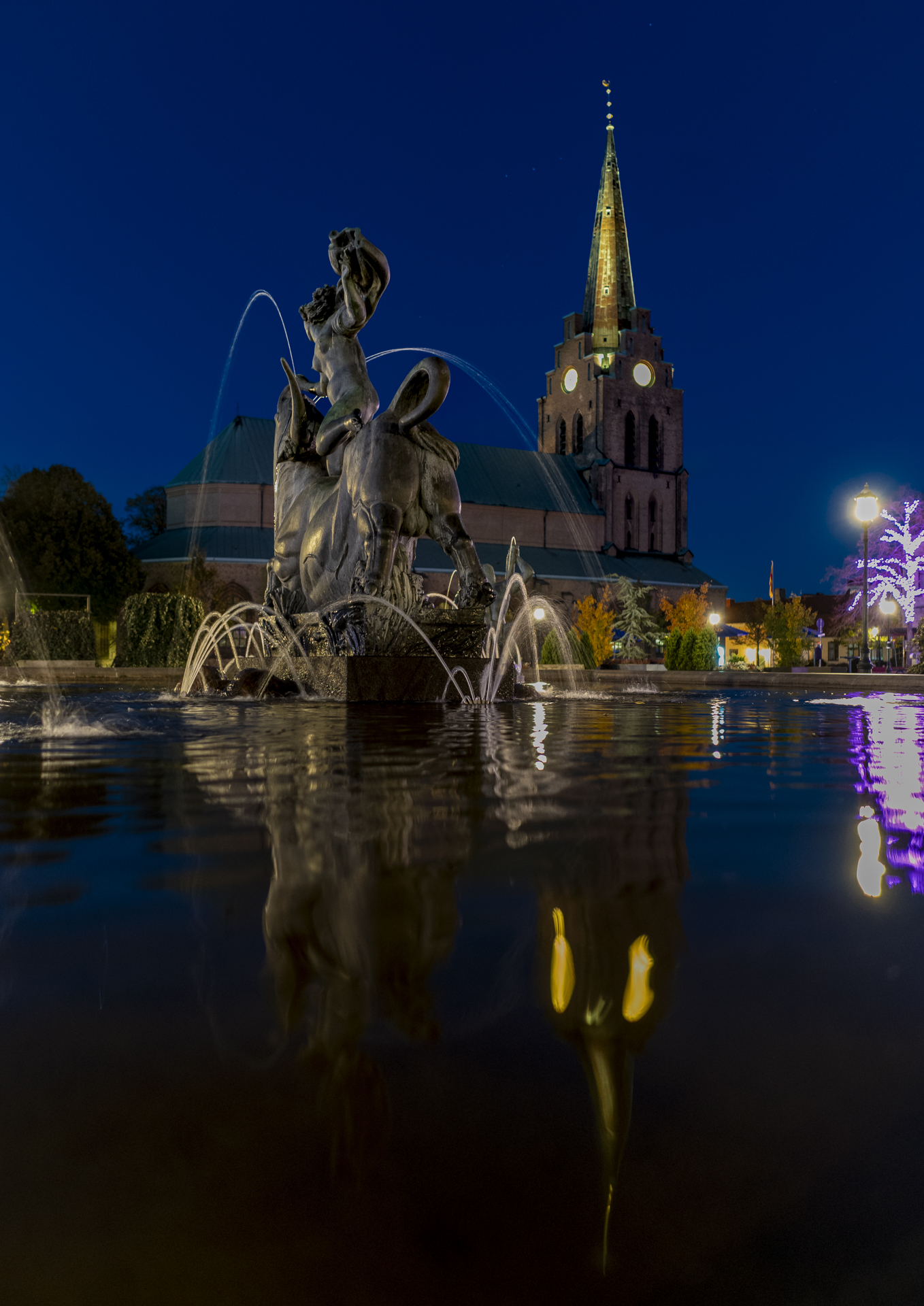 Halmstad mest kända staty i kvällsbelysning. Bra bild men det lila ljuset till höger stör intrycket.