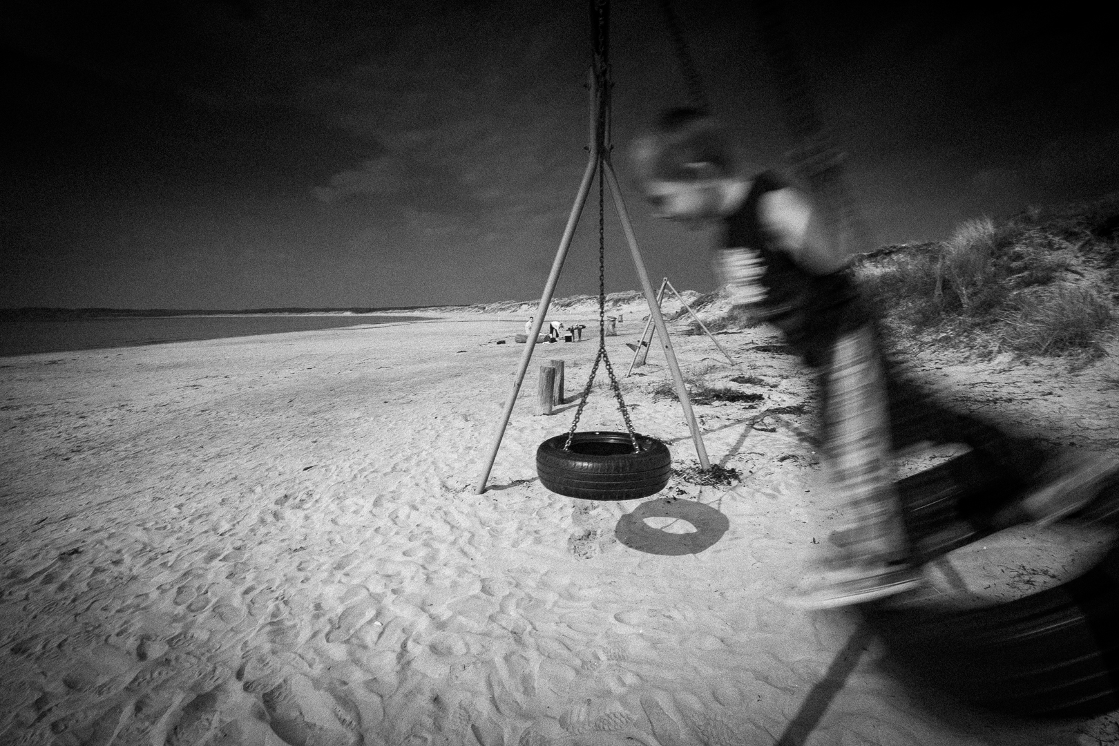 Långa sandstränder är typiskt Halmstad. Här är det full fart. En svartvit bild med intressant komposition och dramatiska kontraster.